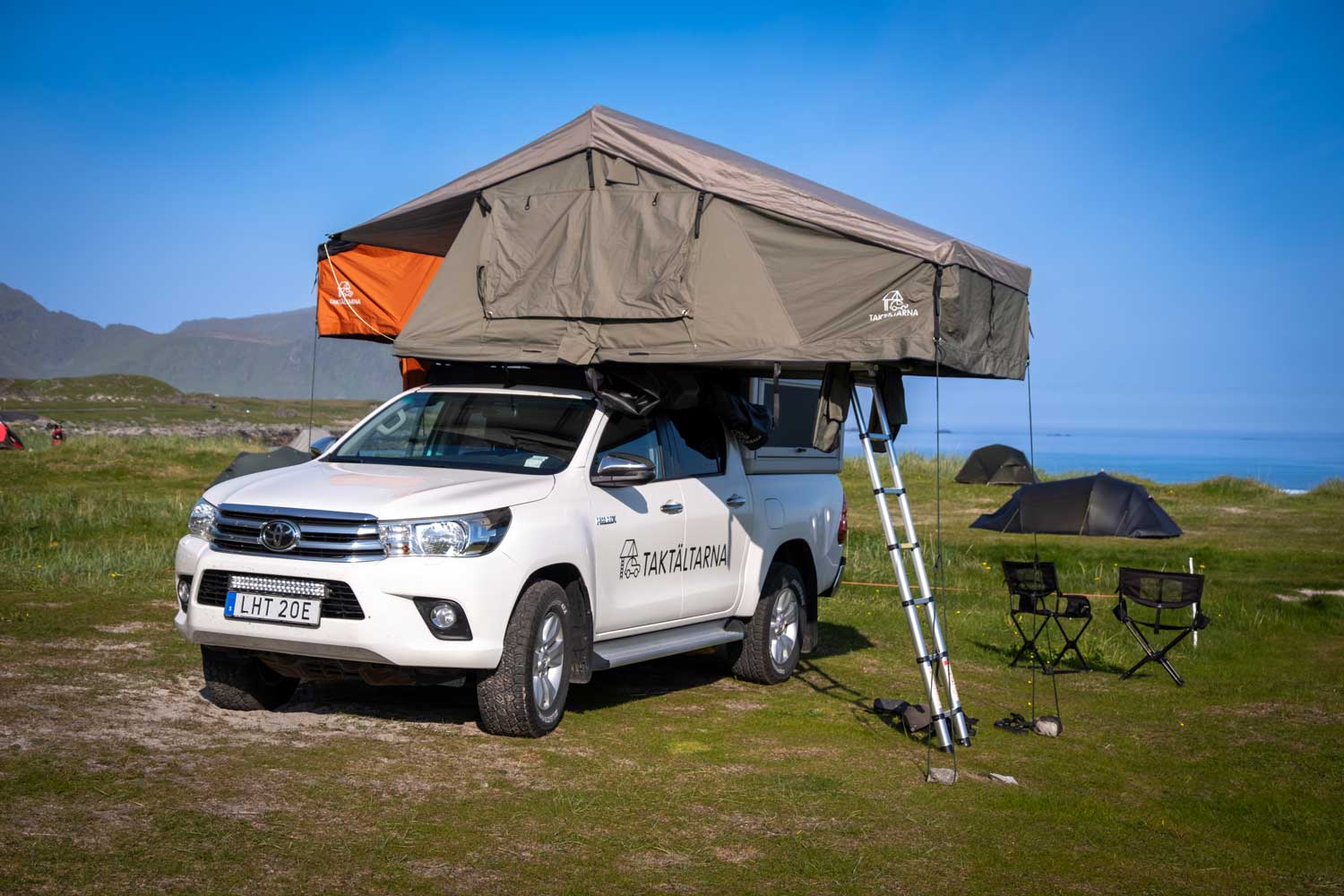 Me (Elisabeth, Taktältarnan perustaja, Björn Falkevik, valokuvaaja, ja Emma Almrorth, kestävän kehityksen neuvonantaja) menimme kattoteltan kanssa Lofooteille viikkoa ennen juhannusta 2023. Mukana olleet kattoteltat olivat kahden hengen Åreskutan 2.0 ja kolmen hengen teltat; käytännöllisiä lava-autolla, johon mahtuu kaksi :).