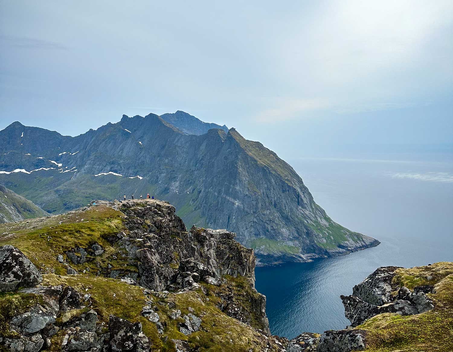 Puolivälissä ylämäkeä meidät palkittiin kauniilla vuoristojärvellä, jossa tietenkin uimme. Ylhäällä näkymä oli (tietysti) aivan uskomaton, näkyvyys oli kirkas ja näimme kilometreittäin Lofoottien vuorenhuippuja sekä suloisen pienen Henningsværin kylän kaukana alapuolellamme.